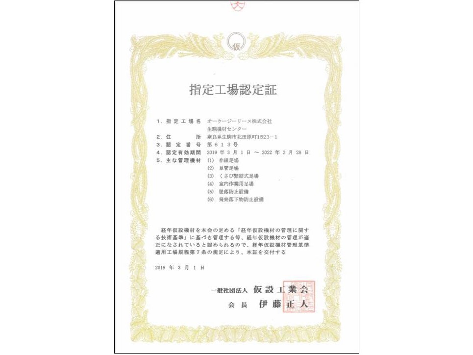各機材センターは、一般社団法人仮設工業会から「適用工場」として認定を受けています。この制度は、経年仮設機材の安全性を確保するため「経年仮設機材管理基準適用工場規程」に基づき、機材の整備・修理等を適正に管理する機材センターを「一般社団法人仮設工業会」が認定するものです。
